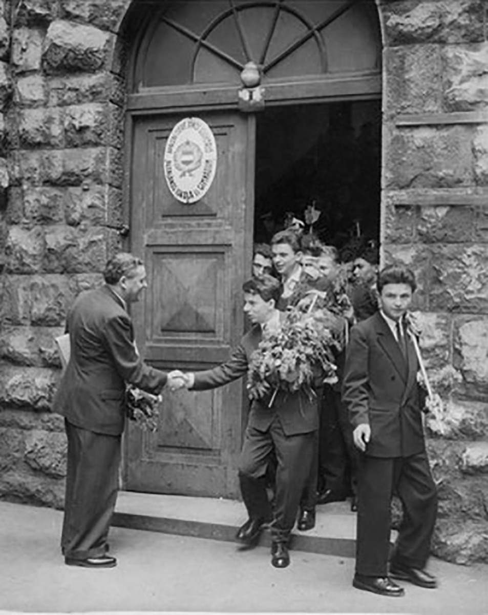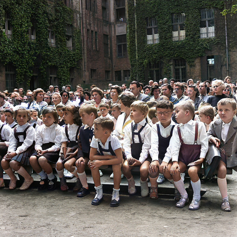 Papnövelde (Eötvös Loránd) utca 4-6. ELTE Apáczai Csere János Gyakorló Általános Iskola és Gimnázium, tanévnyitó ünnepség az udvaron. 1960.