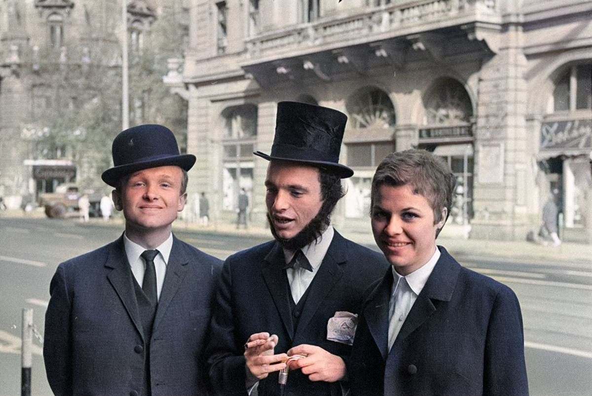 Kossuth Lajos utca, a túloldalon a 20. számú háztól balra a Semmelweis utca torkolata. Az ELTE Apáczai Csere János Gyakorló Általános Iskola és Gimnázium ballagóinak egy csoportja. 1967.