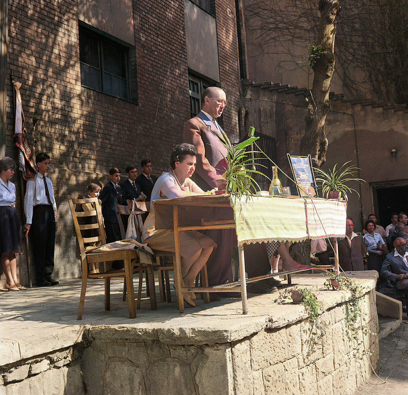 Papnövelde (Eötvös Loránd) utca 4-6. ELTE Apáczai Csere János Gyakorló Általános Iskola és Gimnázium, tanévnyitó ünnepség az udvaron (dr. Temesi Alfréd beszél). 1960.