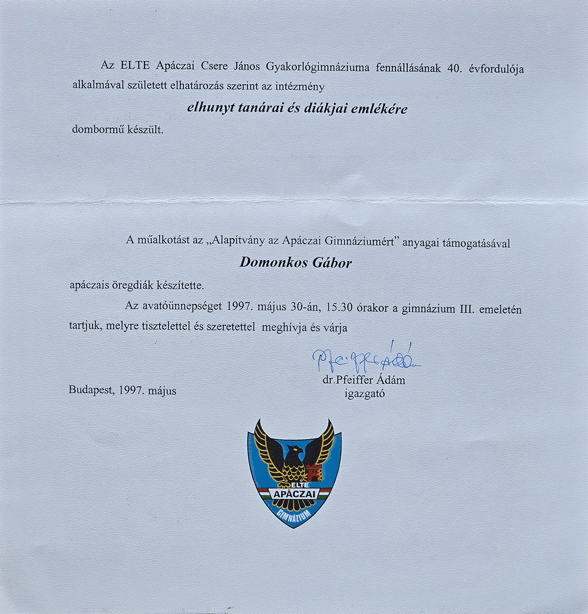 Meghívó az elhunyt apáczaisok emlékére állított dombormű felavatására.