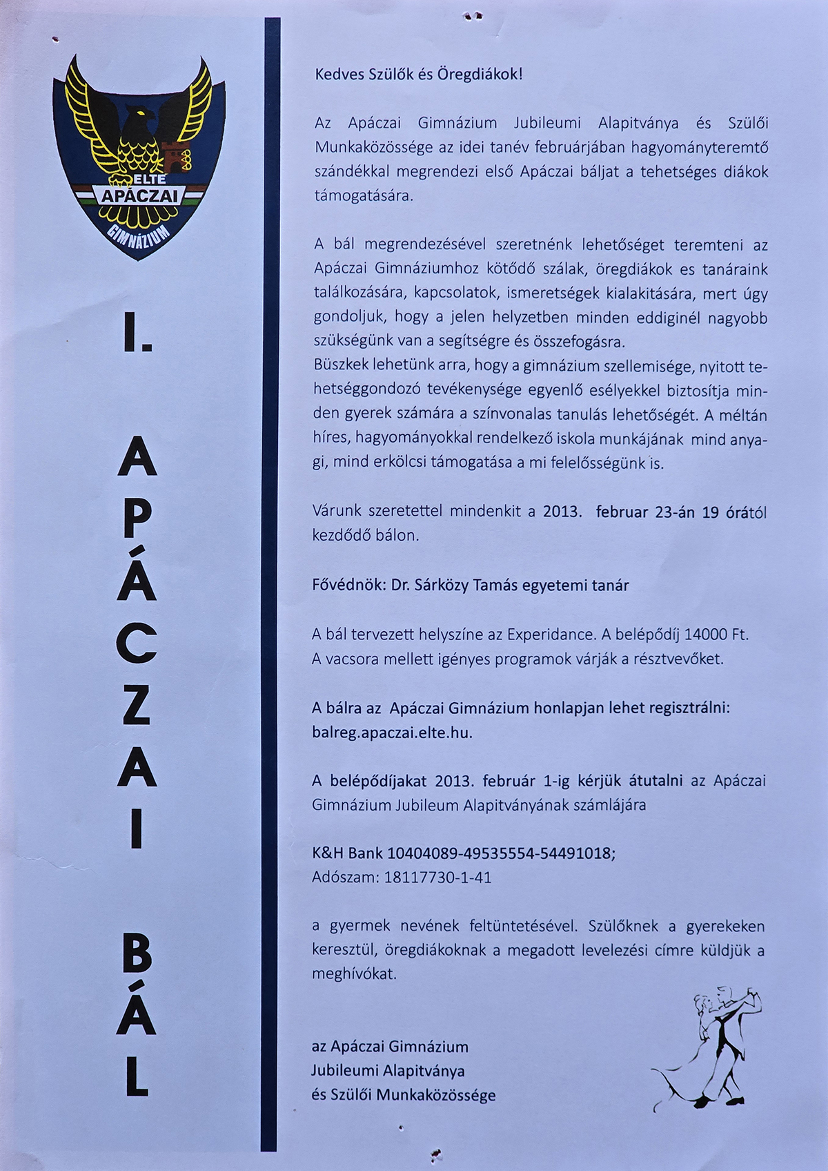 Később Apáczai Támogatói Bál, jelenleg Apáczai Alapítványi Bál.