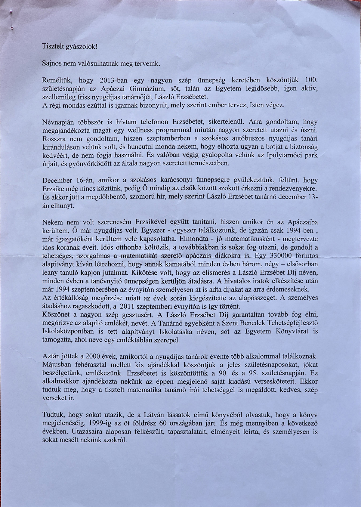 László Erzsébet tanárnő temetésén elhangzott gyászbeszéd, elmondta dr. Pfeiffer Ádám. 2011. (2/3)