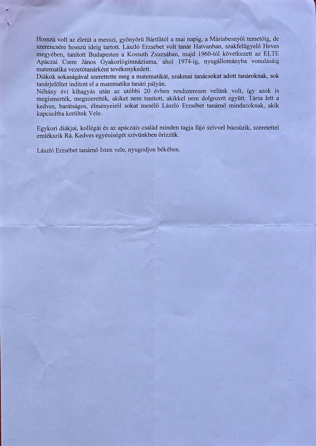 László Erzsébet tanárnő temetésén elhangzott gyászbeszéd, elmondta dr. Pfeiffer Ádám. 2011. (3/3)