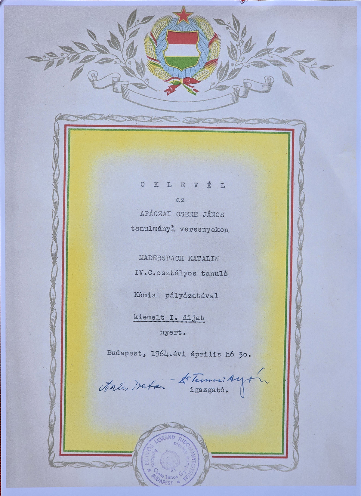 Apáczai Csere János tanulmányi versenyek oklevele. 1964.