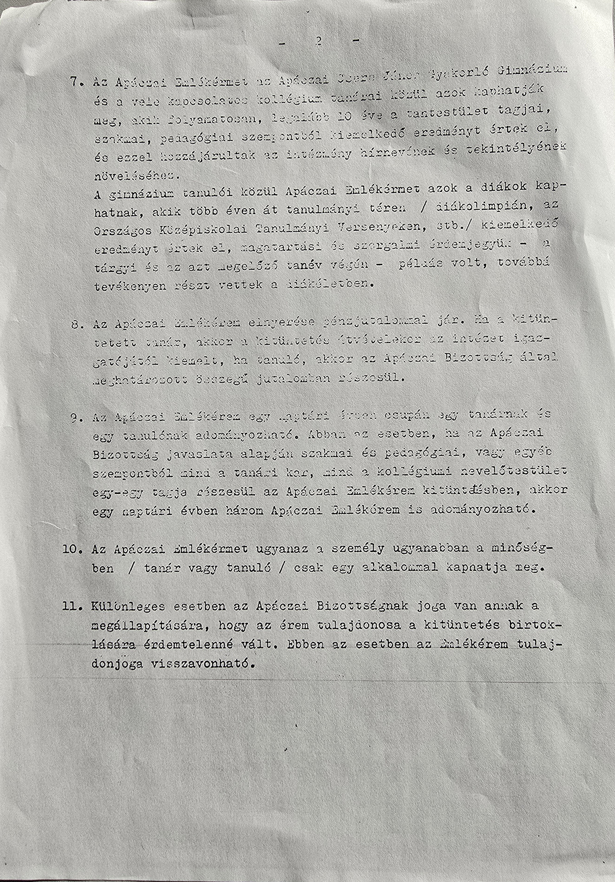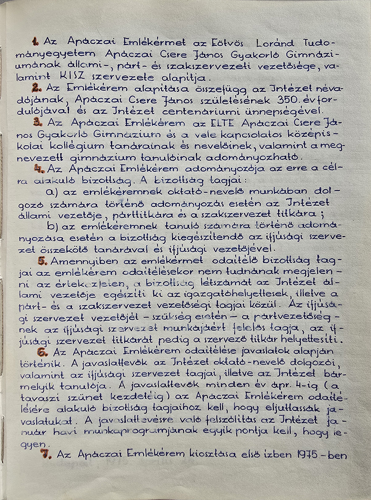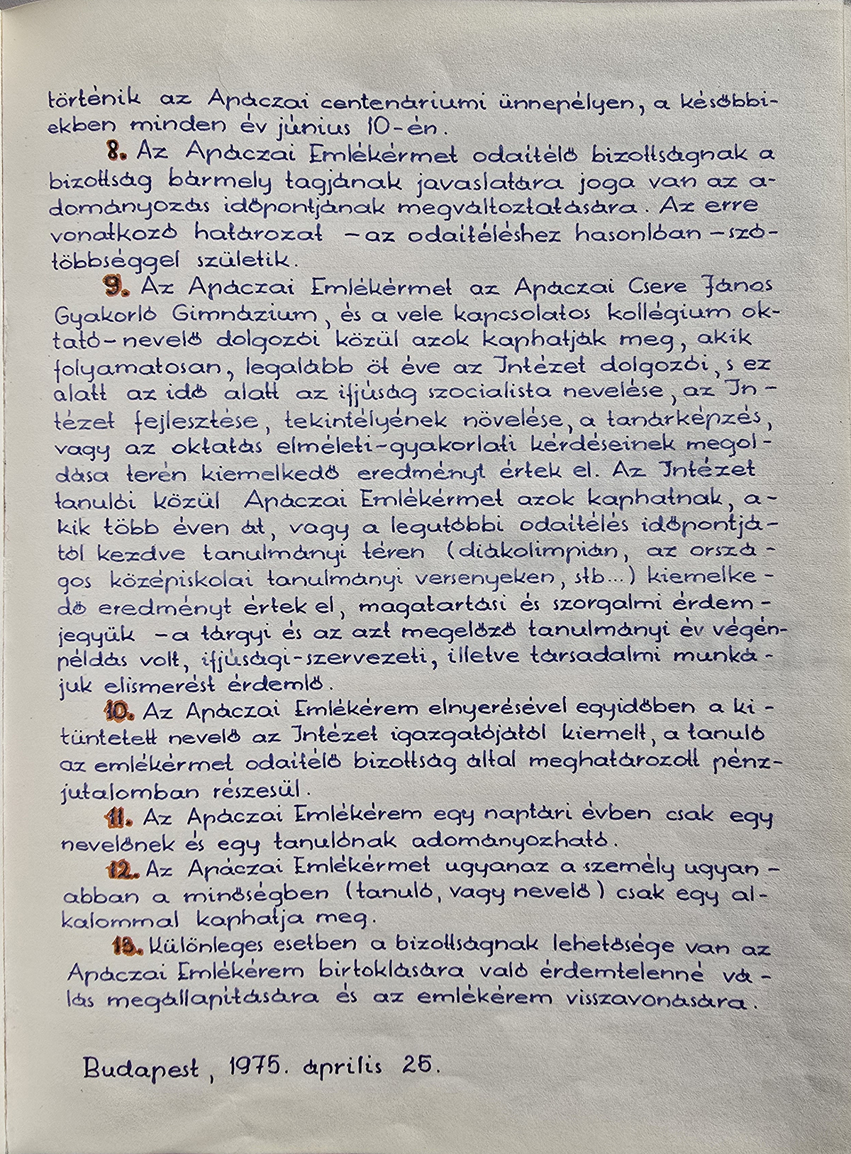 Az Apáczai-emlékérem alapítólevele. 1975. április 25. (2/4).