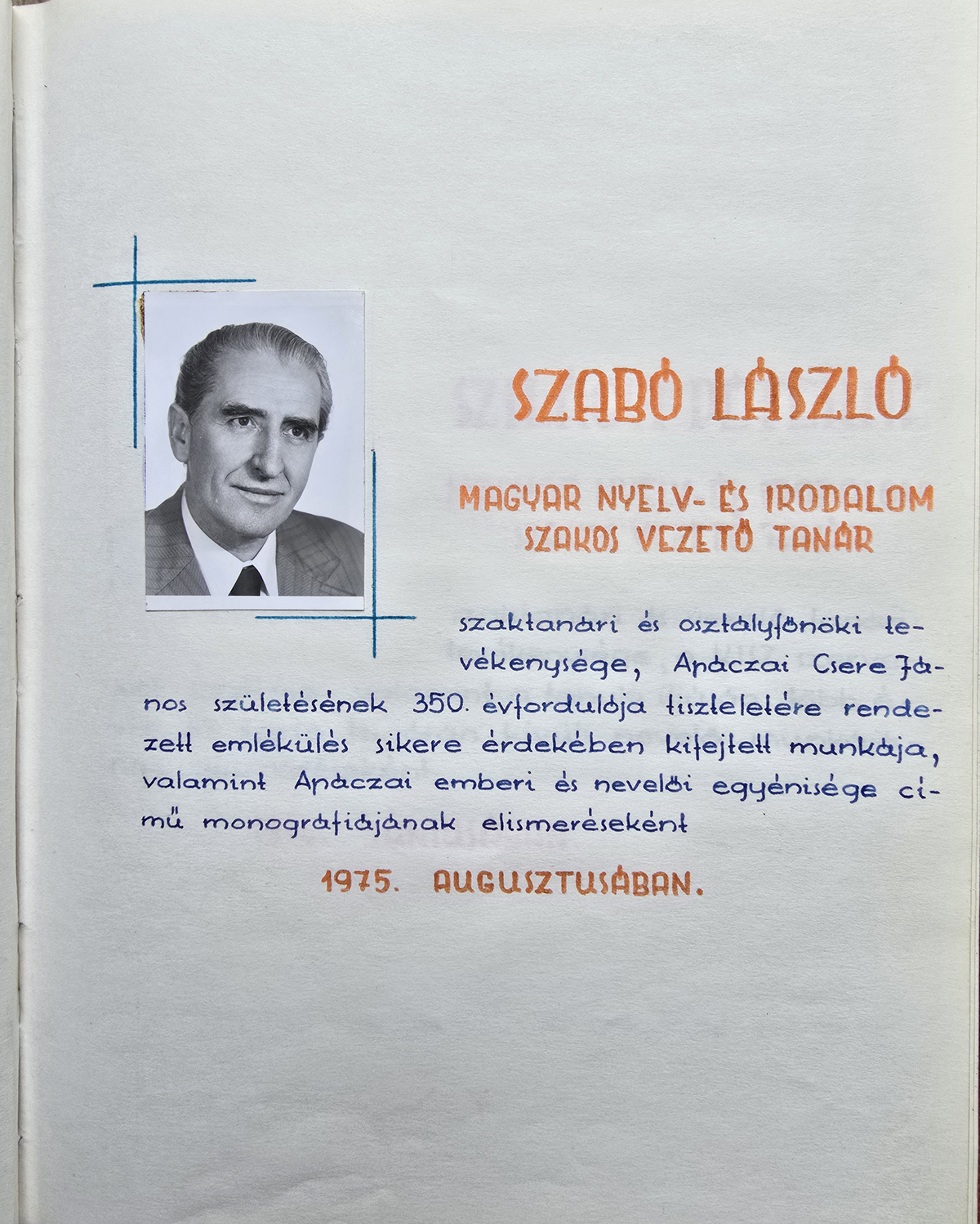 Az Apáczai-emlékérem első tanár díjazottja. 1975.