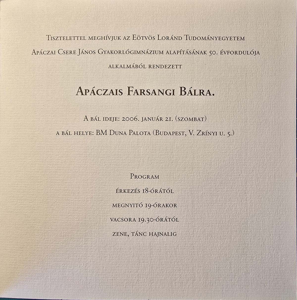 Meghívó az 50 éves jubileum alkalmából megrendezett Apáczai Farsangi Bálra (4/4). 2006.
