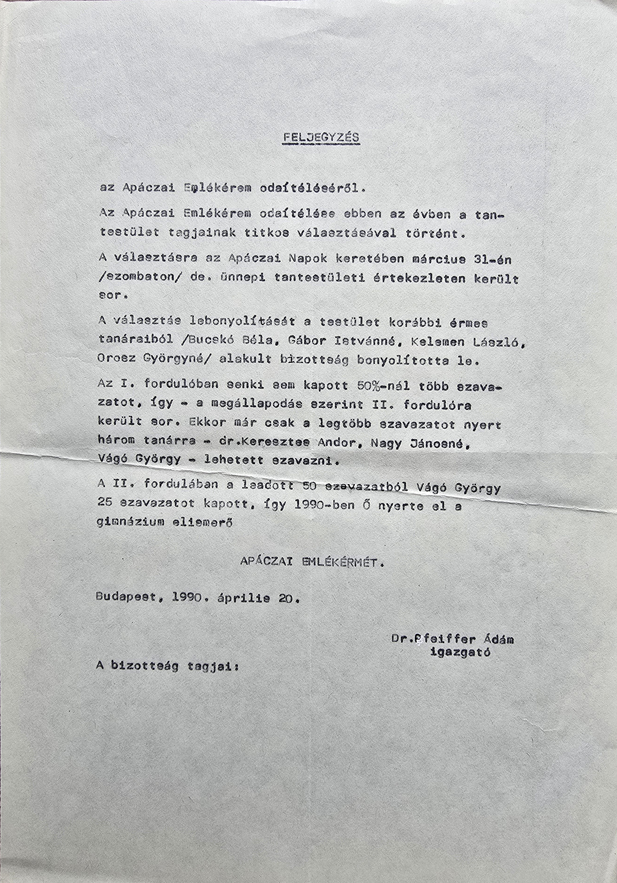 Feljegyzés az Apáczai-emlékérem odaítéléséről. 1990.